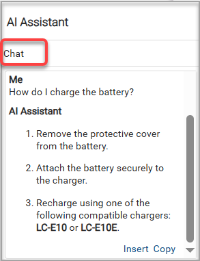 - Chat. Use this option to do a basic search by asking a question. You get results in the form of text that you can Insert or Copy.