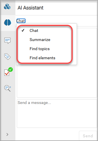Use the different options to tell the AI Assistant what you're searching for. Your choice of option affects the how you ask the question, the results received, and the possible actions you can take.