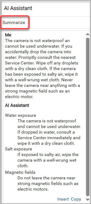 - Summarize. Use this option to ask the AI Assistant to generate new content from text you paste in. You get results in the form of text that you can Insert or Copy.