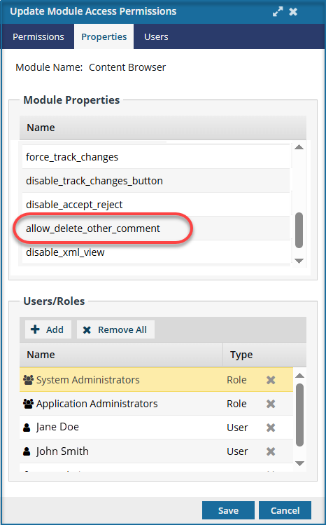 As an Inspire administrator, you can set permissions to grant or deny users and roles access to a specific module. By default, when a user opens a component in the Oxygen editor, they can see comments made by other users but can only delete their own comments. If you want to configure Oxygen behavior for a user or role so that a user can delete another user's comments, you can add them to the Content Browser module's allow_delete_other_comment property in Module Access Management.