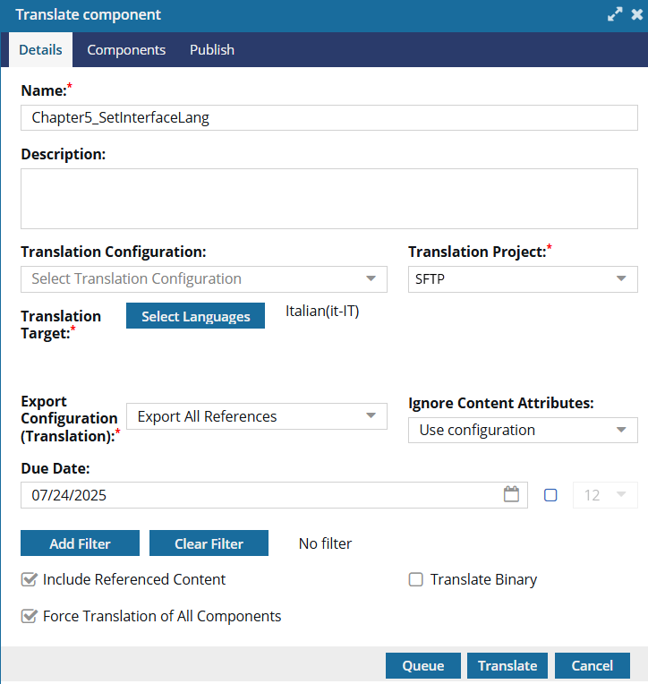 - On the Translate component screen, the coordinator clears the Include referenced components option.