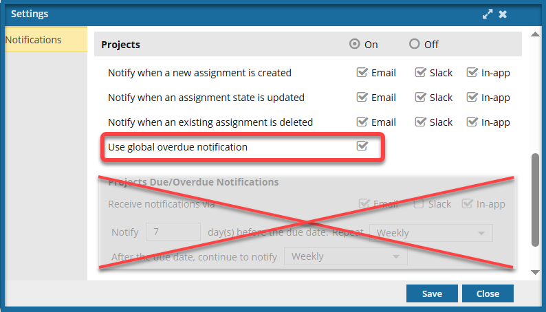 - The new Use global overdue notification option is only available in the Projects notification settings.