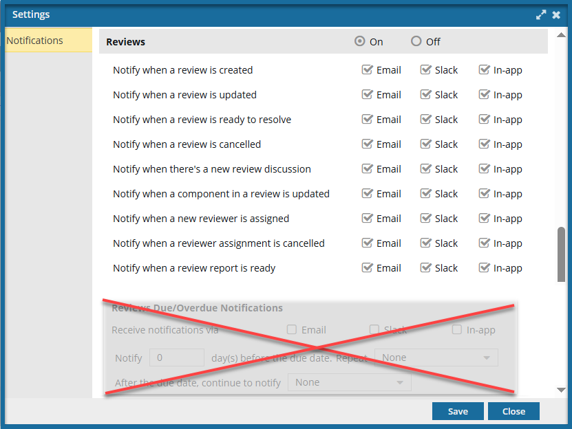 - The Due/OverDue Notification sections are removed from Projects and Reviews.