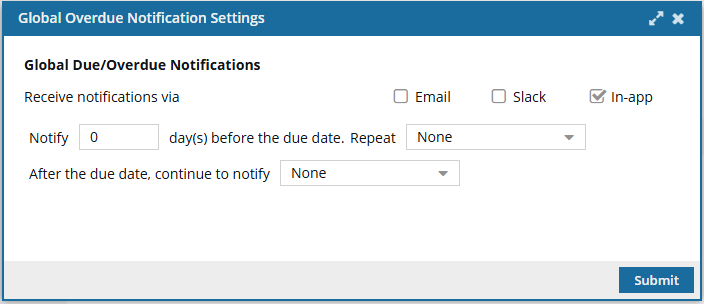 - If selected, you configure settings on the Global Overdue Notification Settings screen.