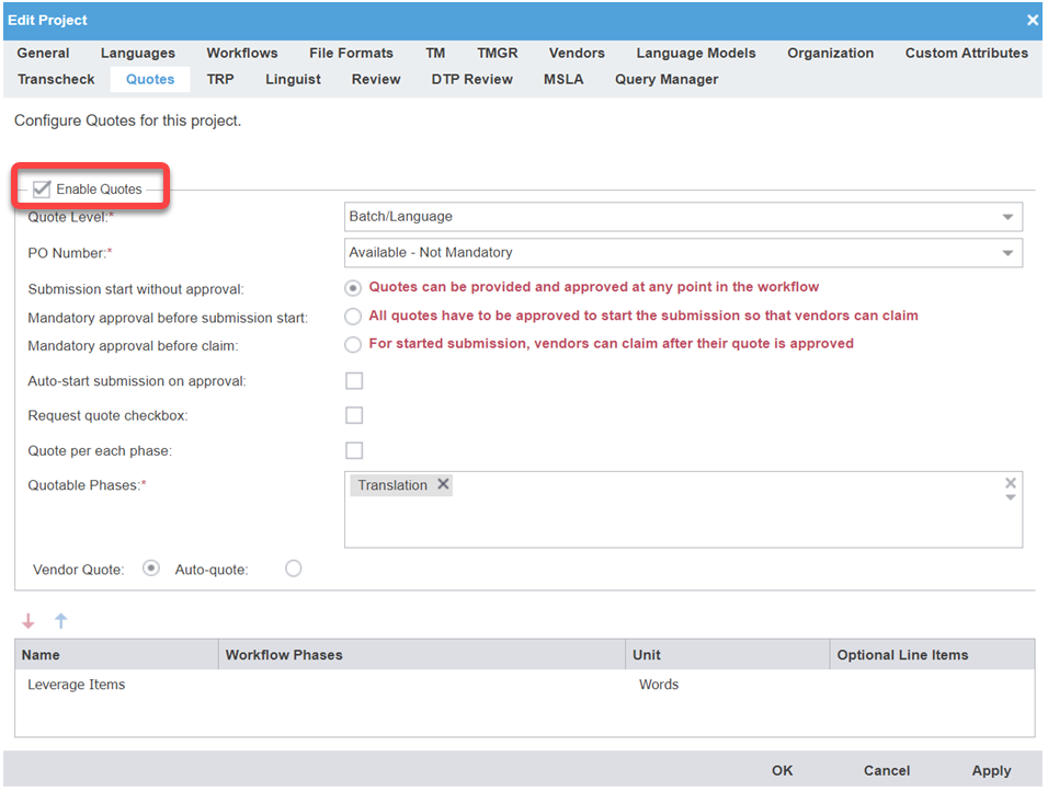 Enable quotes for translation projects