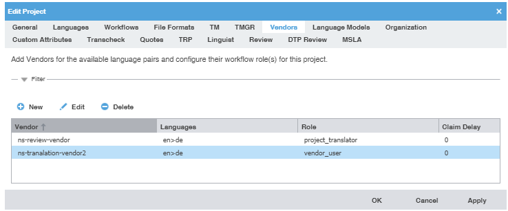 To allow your Inspire translation projects to work with all the languages you need, in GlobalLink Enterprise you can add new vendors who work with other languages or update an existing vendor who may have added more services.