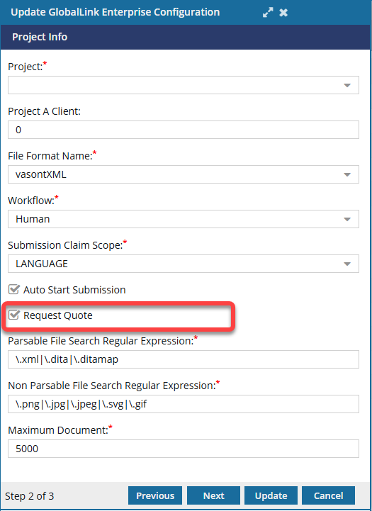 On the Project Info (Step 2 of 3) screen, you must add details about the Project you've created in GlobalLink Enterprise to work with translation jobs coming from Inspire.