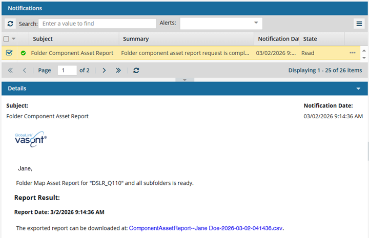 From the list of notifications, select the one that says Folder Component Asset Report.
