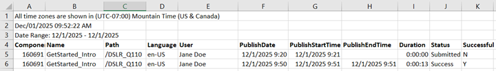 Inspire provides a usage report in a comma-separated value (CSV) file that gives you information about the publishing history for the component you selected.