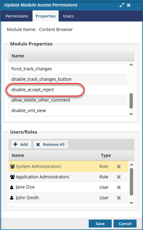 As an Inspire administrator, you can set permissions to grant or deny users and roles access to a specific module. By default, when a user opens a component in the Oxygen editor, and the Change Tracking option is turned on, the user or role can accept or reject the changes. If you want to configure Oxygen behavior for a user or role so that when Change Tracking is on, the user can't accept or reject changes, you can add them to the Content Browser module's disable_accept_reject property in Module Access Management. r or