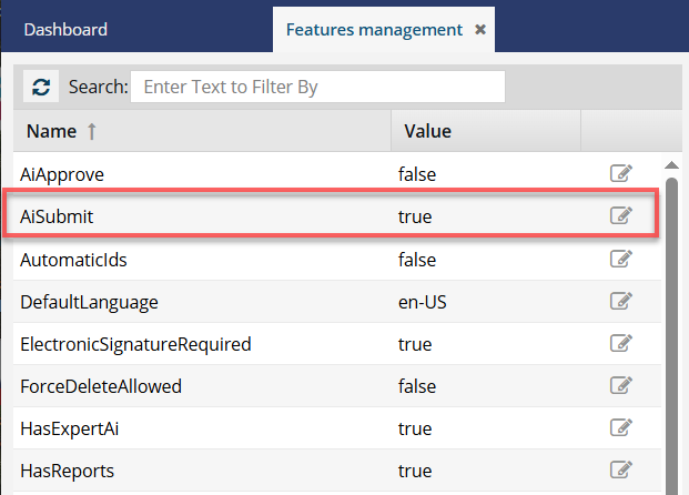 To use the optional feature that allows you to build an AI-powered search in the future or for your own proprietary chatbot, an administrator must enable the types of AI indices that you want to use in Features management. Enabling the AiSubmit feature allows you to create a Submit index to build up the content that is updated and submitted to your Inspire instance. After you enable the feature, you can then create the actual index in AI configuration management.