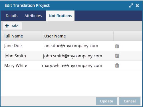 Optionally, you can update a list of Translation Coordinators who are notified when updates are made to a job that uses this project configuration: