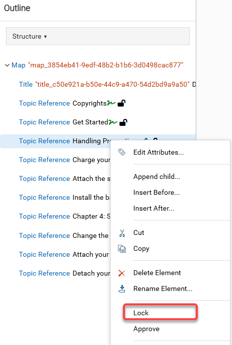 After you make your changes and save and submit the component, you can go back to the Oxygen map outline panel, right-click the unapproved topic, and select Lock.