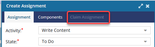 When you create or update a project assignment, if you select a State of Ready to Claim, the Claim Assignment tab becomes available.