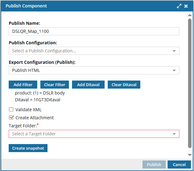 Result: You see the name of any DitaVal file you've applied on the Publish Component screen.