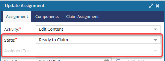 - If you set the State to Ready to Claim, you cannot use the Assigned To field. You must use the Claim Assignment tab to assign different users.