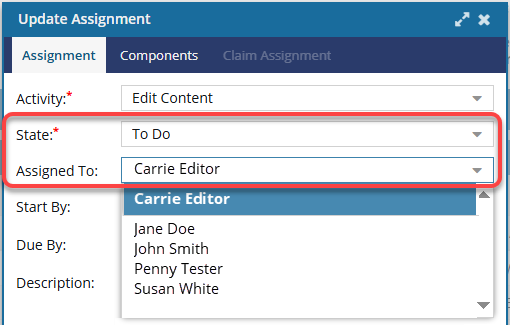 - Otherwise, if you want to use the Assigned To field to identify one specific user, you must cancel the assignment and recreate it with a State that is NOT Ready to Claim.