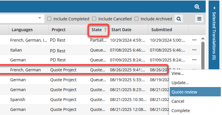On the Translations Management tab, in the list, find the queued translation you want to send for a quote. Make sure it's in the Queued Submission state.