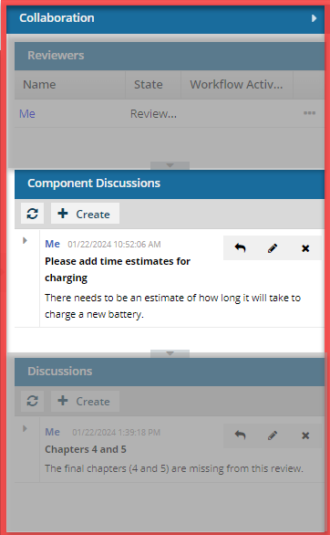 Before a review is marked as completed, you can edit or delete discussion comments about a specific component. These comments are created outside of the Review editor and can be found by opening the Collaboration pane and going to the Component Discussions pane.