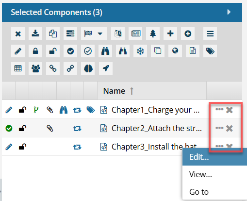 To perform an action on multiple components at once, you can select a few components, an entire page, or all pages of components in a folder from the Components browser. The actions you can take on multiple components at once are displayed as icons.