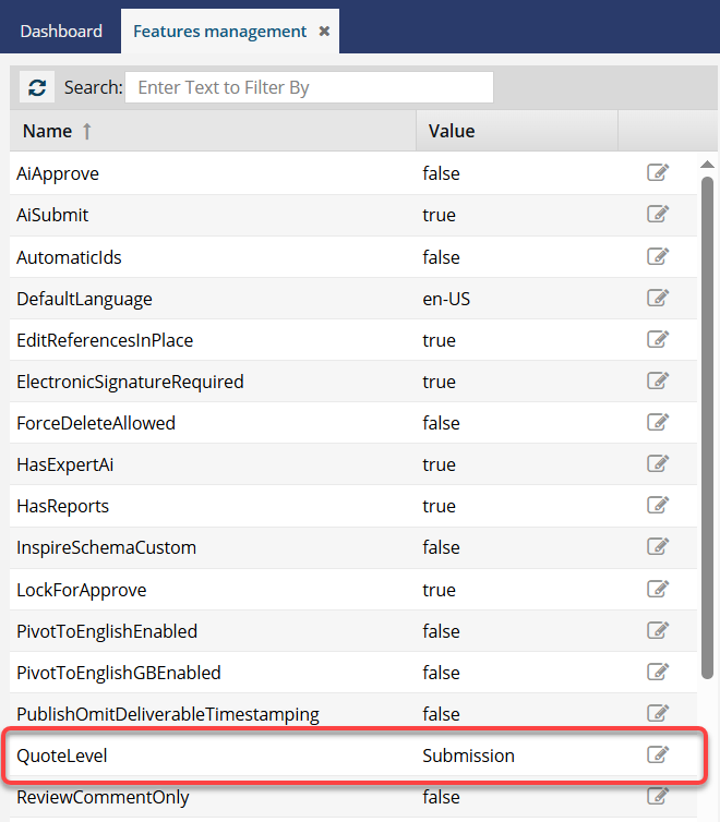 Inspire allows an administrator to use any value in Quote Level. After a translation coordinator requests a quote, if the value in Inspire does not correspond to your translation project in GlobalLink Enterprise, the translation coordinator sees a message that "The GL project quote level does not match the user's feature settings." In this case the translation quote fails to be created.