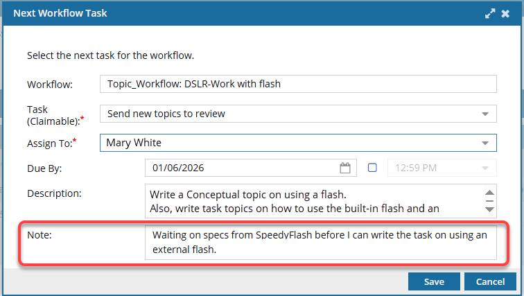 - Notes. When you create a workflow you can enter a Description of the work that needs to be done and a Note to the user who is completing the first task.