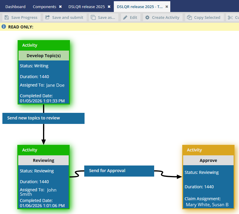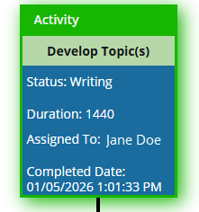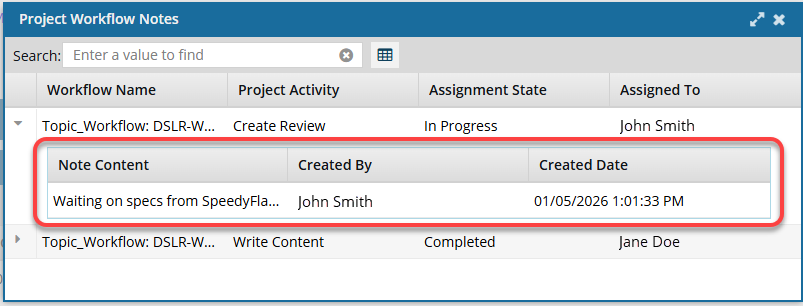 After you create a workflow, you see more tracking details by reading the notes users can leave when completing a task, and by seeing the workflow template with status highlights. The Notes and Status options are only available for Topic workflows.