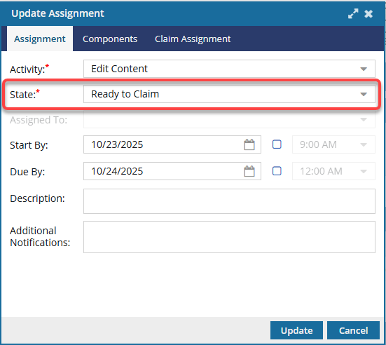 If you previously set the State to Ready to Claim, you can only change it to In Progress or Cancelled. The change to a Cancelled State can only be done by a Coordinator. If you need to change the State to anything else, you must cancel the assignment and re-create it.