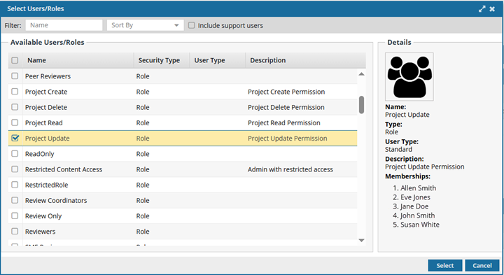 On the Select Users/Roles screen, select the checkbox for each user or role you want to send a notification to and allow to claim this assignment.
