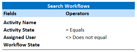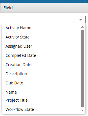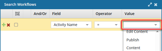 - Field as Activity Name, Operator as Equal, in Value you see a list of activities configured for workflows. You can also type in a word or phrase in Value.