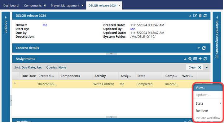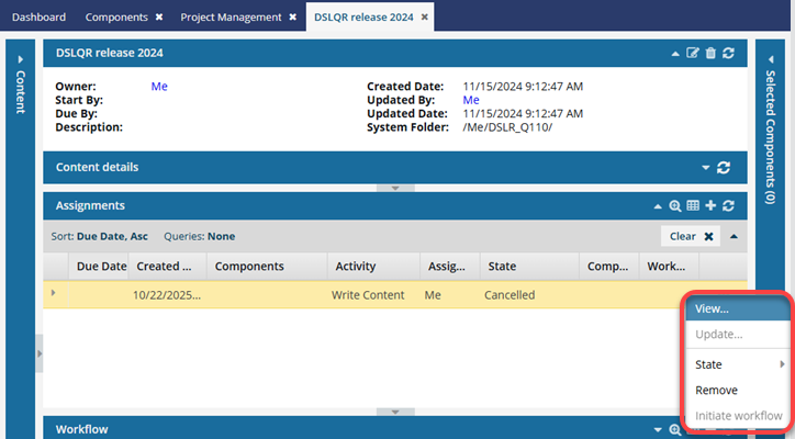 In this State, the assignment exists as a placeholder. You do not have to assign a user to complete the assignment or add any components. A project owner or user with permissions can take the following actions on an assignment in this state: