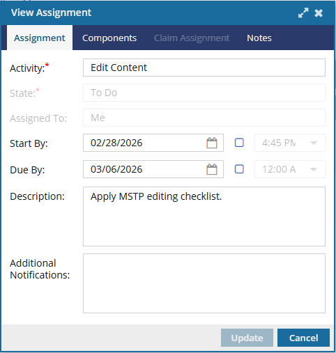 - If a project hasn't been completed yet, you can update the details of an assignment. Follow the steps in Update an assignment.