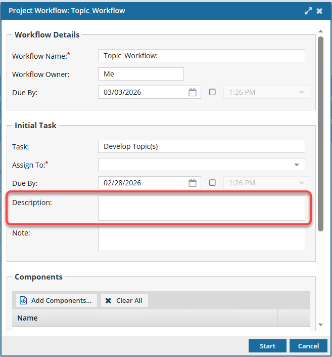 - Description is a property of a project workflow. You enter text in this field when you create a workflow.