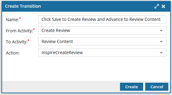 • Click Save to Create Review Transition: Create this Transition to use the new Action of InspireCreateReview. This Action tells Inspire to open the Create Review screen for the current user and populate any known details. You will also need to connect it to go From the new Create Review Activity To the Review Content Activity.
