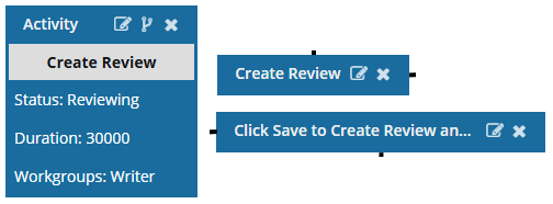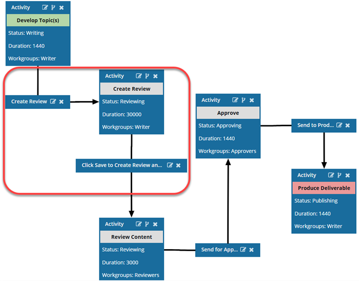 • After the Develop Topic(s) Activity is complete, the user in the Writer Workgroup must manually create a review and assign it so that the workflow advances to the Review Activity.