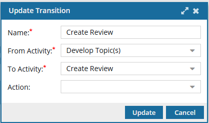 Inspire provides you with a template for the process of developing content. The Topic Workflow template Inspire provides includes an Activity for Reviewing content. By default, the Transition from the Developing topics Activity to the Reviewing content Activity is completed manually by the user in the Writer Workgroup. To automate the process, you can add an Action to have Inspire open a new Create Review screen automatically and populate any known details so the workflow user can quickly create the review and advance the workflow to the next stage (Reviewing).