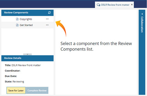 After you open a project, you can go to the workflow pane, and for any review workflow use the Options menu to open the review editor to select a topic and review it.