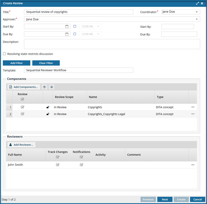 Result: The Select Project Components screen closes and you are returned to the Create Review screen.