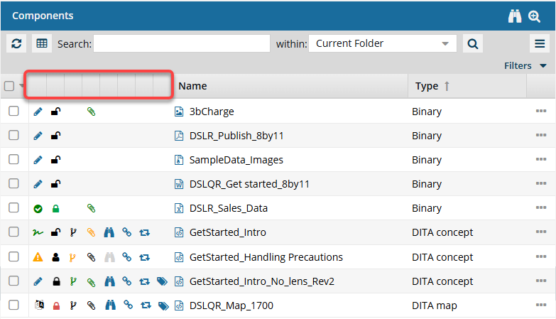 ). The eighth column tells you if at least one component tag has been added to a component's Inspire-based metadata. To see a list of all tags applied, hover your cursor over the tag icon. - File Type (