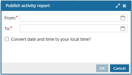 • The report only contains publishing events that occur on or after March 13, 2025. The Publishing activity report feature was not available before the release of Inspire 2025.1.2.0 and any publishing events before those dates aren't included in the report.
