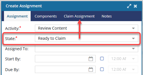 - Make an assignment Claimable. A project assignment can be given a State of Ready to Claim. In this scenario, no specific user is assigned to complete the work. Instead, a list of possible users is identified and they are all notified that the assignment can be claimed. The first user to claim the assignment by setting the State to In Progress can complete the work. This option to make an assignment Claimable is available when working with project assignments and workflow activities.