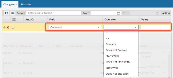 - Contains: show only changeset records where the Comments have some of the characters you entered in Value