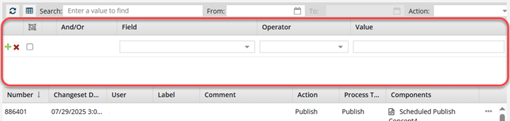 (Greater than or equal to): show all changeset records that have the same number or are higher than the date you select in Value