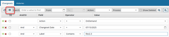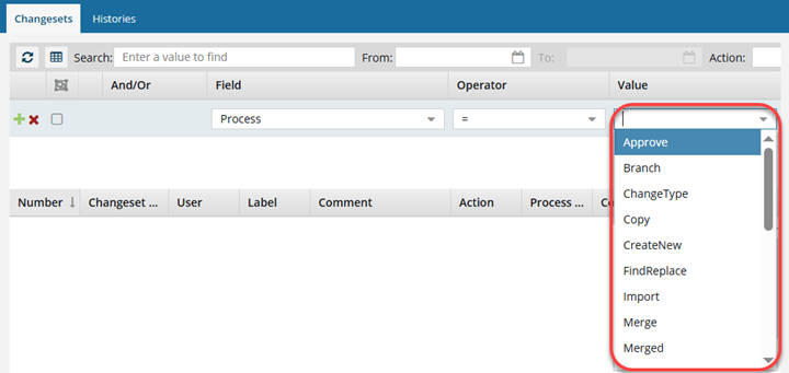 - = (Equals): show only changeset records that have the exact Process option you select in Value