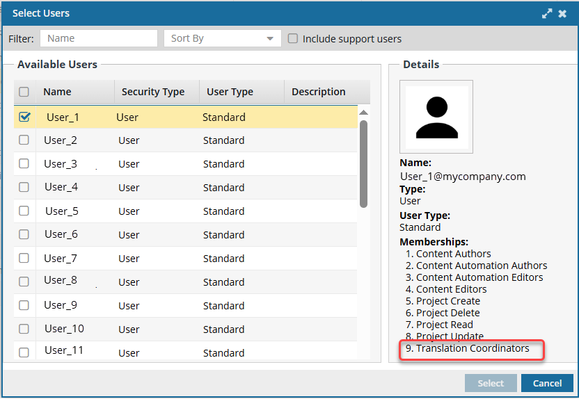 ii. On the Select Users screen, select the checkbox for each user that you want to be notified when a translation job is updated.