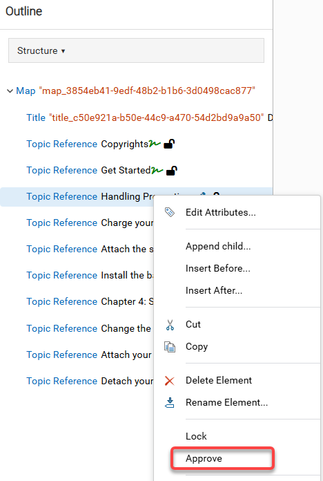 After you make your changes and save and submit the component, you can go back to the Oxygen map outline panel, right-click the unapproved topic, and select Lock.