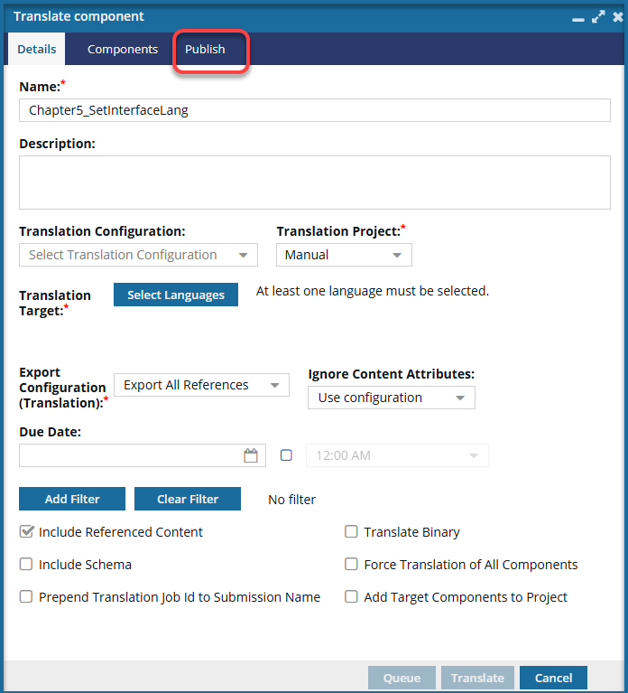 - If you select a Publish Configuration, after the translation of all topics for a single language completes, a publishing request is automatically created by Inspire. This request is to publish the translation of the source components that just completed.