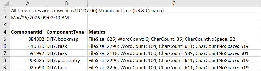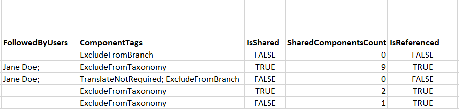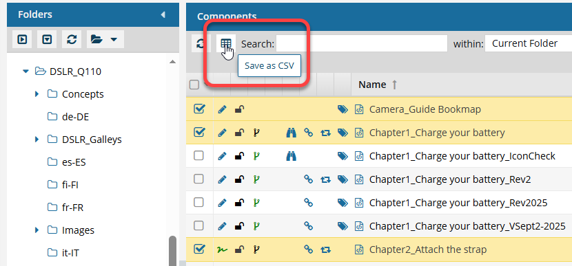 - You can't select which columns to include. All columns that can be displayed in the Components browser are included in the CSV file.