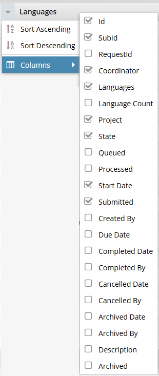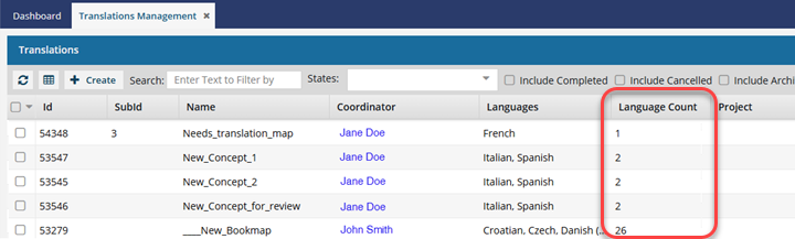 On the Translation Management tab, you see a list of translation jobs. If you want to see more details about jobs on this main grid, you can show hidden columns, such as Language Count. This number tells you the total number of target languages used in a translation job.