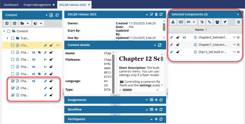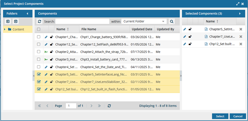 When working in a project, the Content pane shows you icons about a component's properties. If you need to see more of the component name so that you can select the ones you want, you can open the Select Project Components screen.